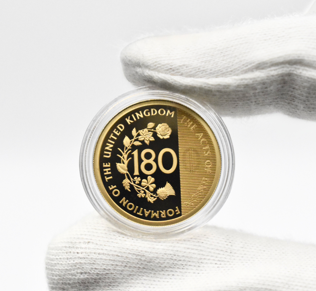 Now, to celebrate this pivotal moment in the formation of our nation, new gold sovereign coins have been released. This marks an exciting moment in coin design, as this new coins features a design element never seen before on sovereign coins! For the first time ever, the artwork contains a lenticular feature, the result of which is that the main date in the design changes – from 1800 to 1801 – as you tilt each coin, creating a dynamic hologram-like effect!