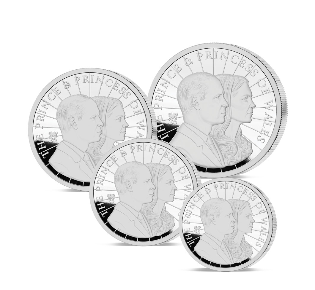 • Each coin features a side by side profile portrait of the Prince and Princess of Wales, behind which there are 25 radiating starbursts, with a number 25 Privy Mark surmounted by a Welsh dragon alongside.